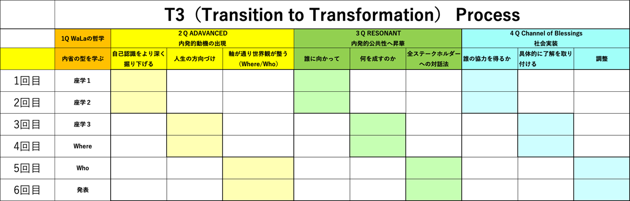 企業幹部向けプログラムとして強い内発的動機をもったリーダーを生み出すT3プログラム(Transition to Transformation)がございます。これはWaLaの哲学の3ヶ月を含む、一年間のプログラムとなっております。